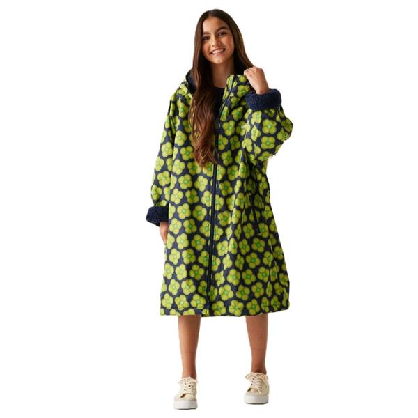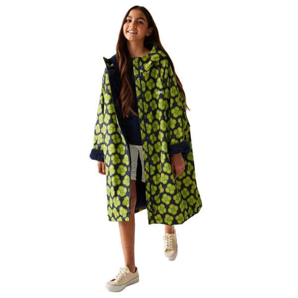 Weatherproof, stylish and comfy, our Orla Kiely Girls' Changing Robe is perfect for beach days. Crafted from waterproof Hydrafort 100% polyester fabric with taped seams, this robe ensures complete waterproof protection, making it perfect for changing in or out of swimwear. The durable water-repellent finish adds extra resilience against the elements. Inside, it features a cosy borg fleece lining for added warmth and comfort. The grown-on hood provides extra coverage, while the two lower pockets offer practical storage for essentials. Adorned with vibrant all-over prints designed by Orla Kiely, this girls' changing robe combines functionality with fun, making it a must-have for any young adventurer.